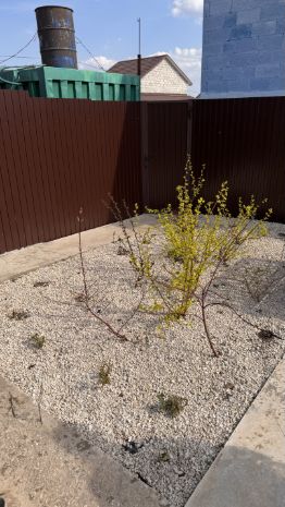 На участке газон и много роз, посажены туи, голубая ель, можжевельники.