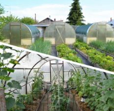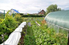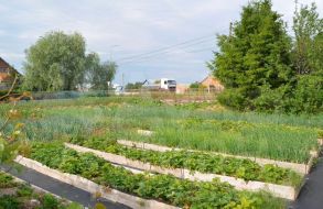 Огород с тремя обновлёнными теплицами, здесь же четыре ёмкости для полива