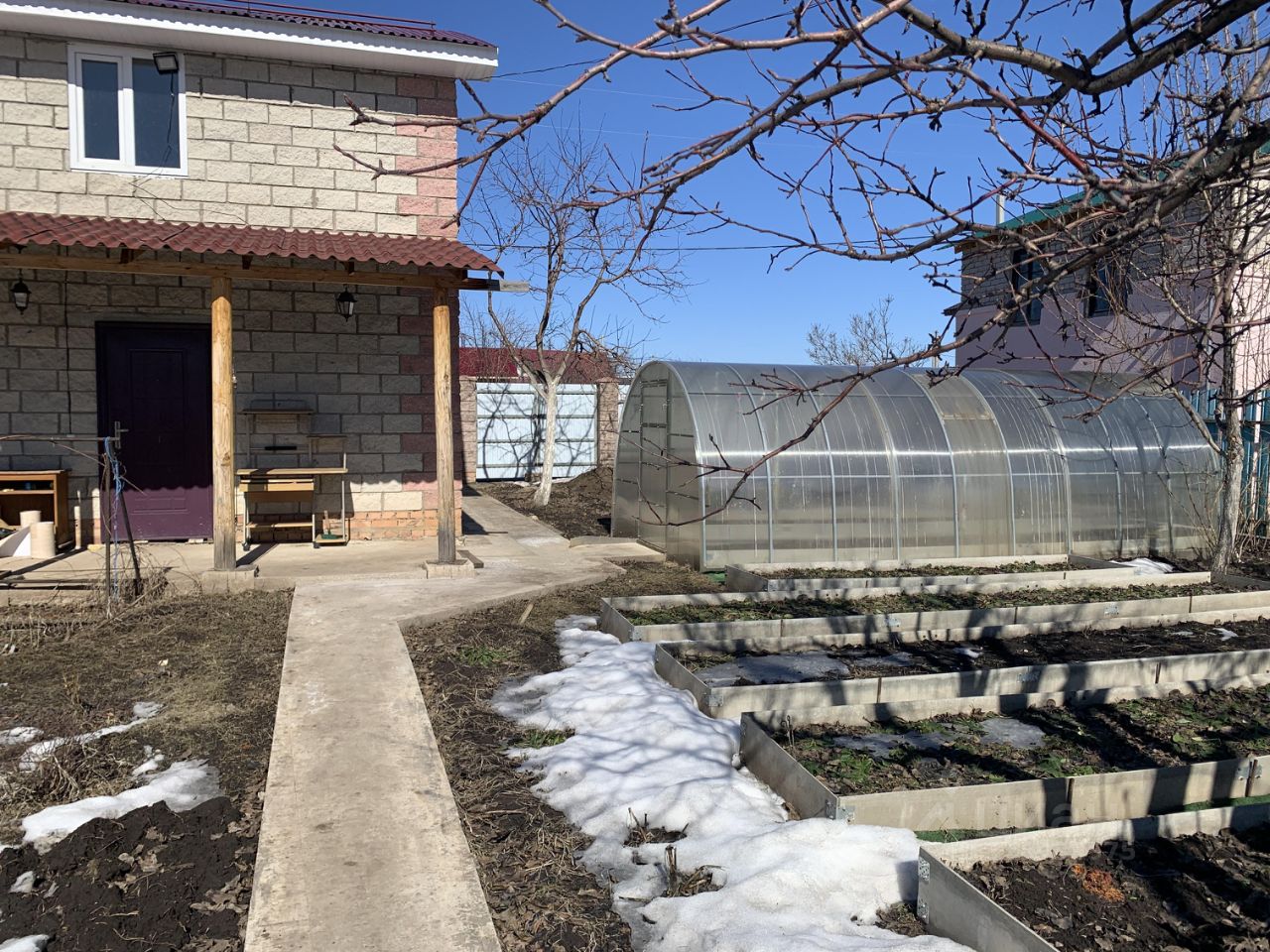 На участке также есть блочный хозблок с рольставнями, теплица, срубовая баня и беседка с мангальной зоной. Установлен летний душ и уличный туалет.
