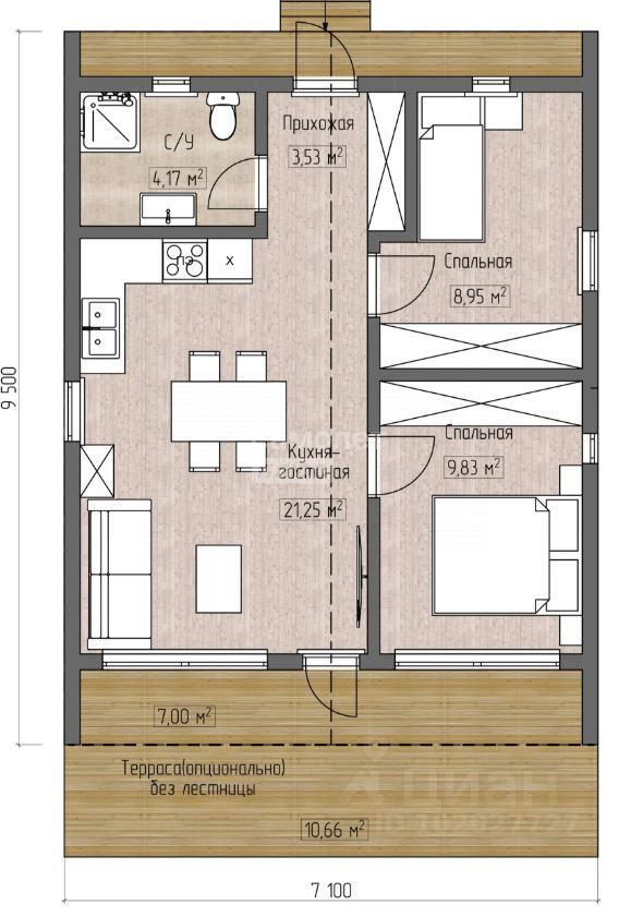 Продуманная планировка для жизни: Общая площадь 58.7 м², полезная — 47.7 м². В доме предусмотрены 2 светлые спальни и 1 санузел. Сердце дома — просторная кухня-гостиная площадью 20.69 м², где вы сможете собираться всей семьей и принимать гостей. А если захочется уединения, общую зону можно легко изолировать.