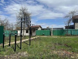 Участок огорожен забором, имеются ворота с калиткой, парковка выложена плиткой на 2 машины. Электричество, летняя вода, рядом газ. Соседи живут круглогодично. На участке имеются насаждения- виноград, абрикос, груша, туи, елки,,цветы; сооружен спортивный уголок, кирпичный туалет.