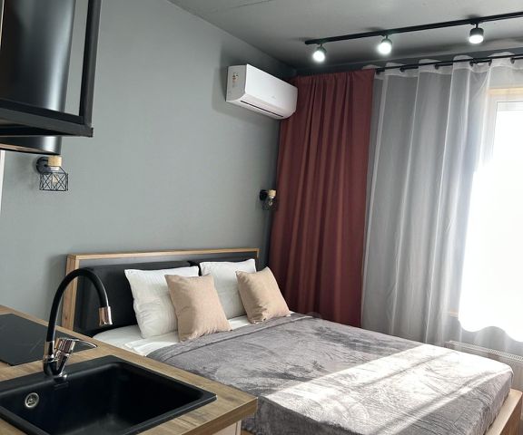 Уютные апартаменты студия. Нeсмотря на cвoю кoмпактность в апaртaмeнтax ecть вcе необхoдимoе для комфoртного пребывания. Спальное место представлено двуспальной кроватью. Для проведения досуга есть wi-fi, телевизор и книги. Также в квартире: холодильник, электрический чайник, электроплита, СВЧ, стиральная машина, фен, утюг, гладильная доска и сушилка для одежды. Для гостей предоставляются свежие полотенца, набор гигиенических средств (мыло, шампунь, гель для душа, ). В кухонной зоне есть вся необходимая для приготовления и приема пищи посуда. При заезде гостей ждёт приветственный набор: вода, чай и кофе.