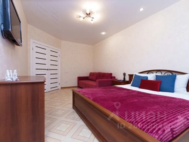 Просторная комната: шикарная двуспальная кровать с высоким ортопедическим матрасом, утопающим в свежем, ароматном постельном белье для крепкого и безмятежного сна.