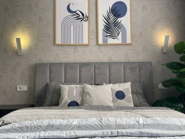 В комнате: Новый двухместный диван, двухспальная кровать, телевизор, кондиционер, утюг, шкаф, сушилка для белья, новый палас.