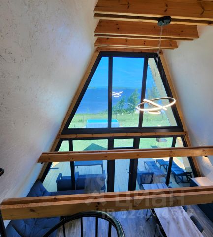 Окна зала и спальни выходят на участок и озеро, окна кухни-столовой на газон с туей и зоной мангала, забор заплетён виноградом.