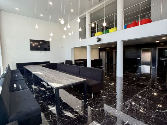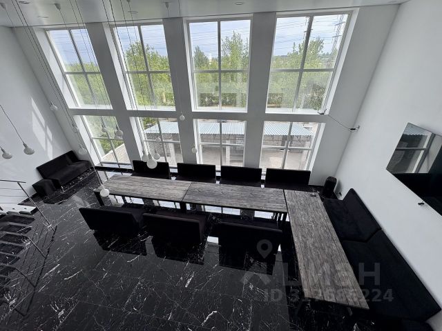 На первом этаже просторная Кухня-гостиная с панорамными окнами и видом на озеро, с большим столом и уютным диваном.