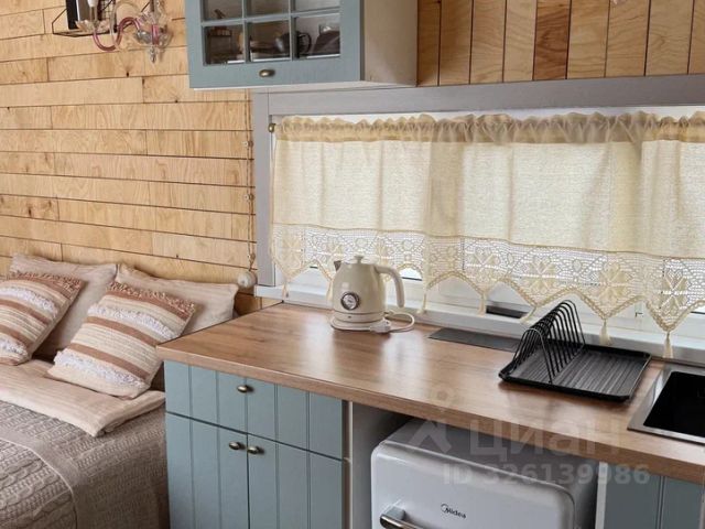 На кухне есть: холодильник, двухкомфорочная электрическая плита, микроволновка, чайник. Духового шкафа нет. Посуда: 8 больших плоских тарелок, 8 тарелок для супа, 3 маленькие пиалки, 2 средних салатника, 8 суповых ложек, 8 вилок, 8 чайных ложек, 8 столовых ножей, 2 средних сковороды 24 см, 1 средняя кастрюля 5 л, 8 стаканов для сока, 8 бокалов под шампанское, 8 рюмок, 8 чайных бокалов, 2 разделочные доски, 4 ножа, 1 половник, штопор-открывашка, 1 лопатка для сковородки, тёрка, пепельница.