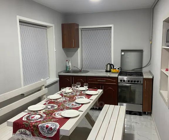 На кухне есть: холодильник, двухкомфорочная электрическая плита, микроволновка, чайник. Духового шкафа нет. Посуда: 8 больших плоских тарелок, 8 тарелок для супа, 3 маленькие пиалки, 2 средних салатника, 8 суповых ложек, 8 вилок, 8 чайных ложек, 8 столовых ножей, 2 средних сковороды 24 см, 1 средняя кастрюля 5 л, 8 стаканов для сока, 8 бокалов под шампанское, 8 рюмок, 8 чайных бокалов, 2 разделочные доски, 4 ножа, 1 половник, штопор-открывашка, 1 лопатка для сковородки, тёрка, пепельница.