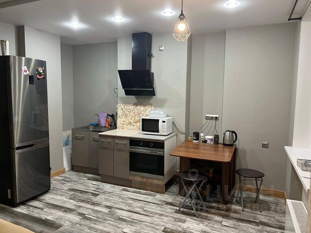 На кухне кухонный гарнитур, холодильник, микроволновка, обеденная зона (стол и стулья).
