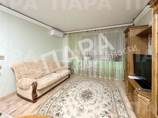 В зале есть раскладной диван с бельевым ящиком, рабочее место, огромный шкаф с полками и большим вертикальным отделением. Лицевая сторона шкафа полностью зеркальная, благодаря этому комната смотрится еще просторнее. В зале установлен кондиционер.